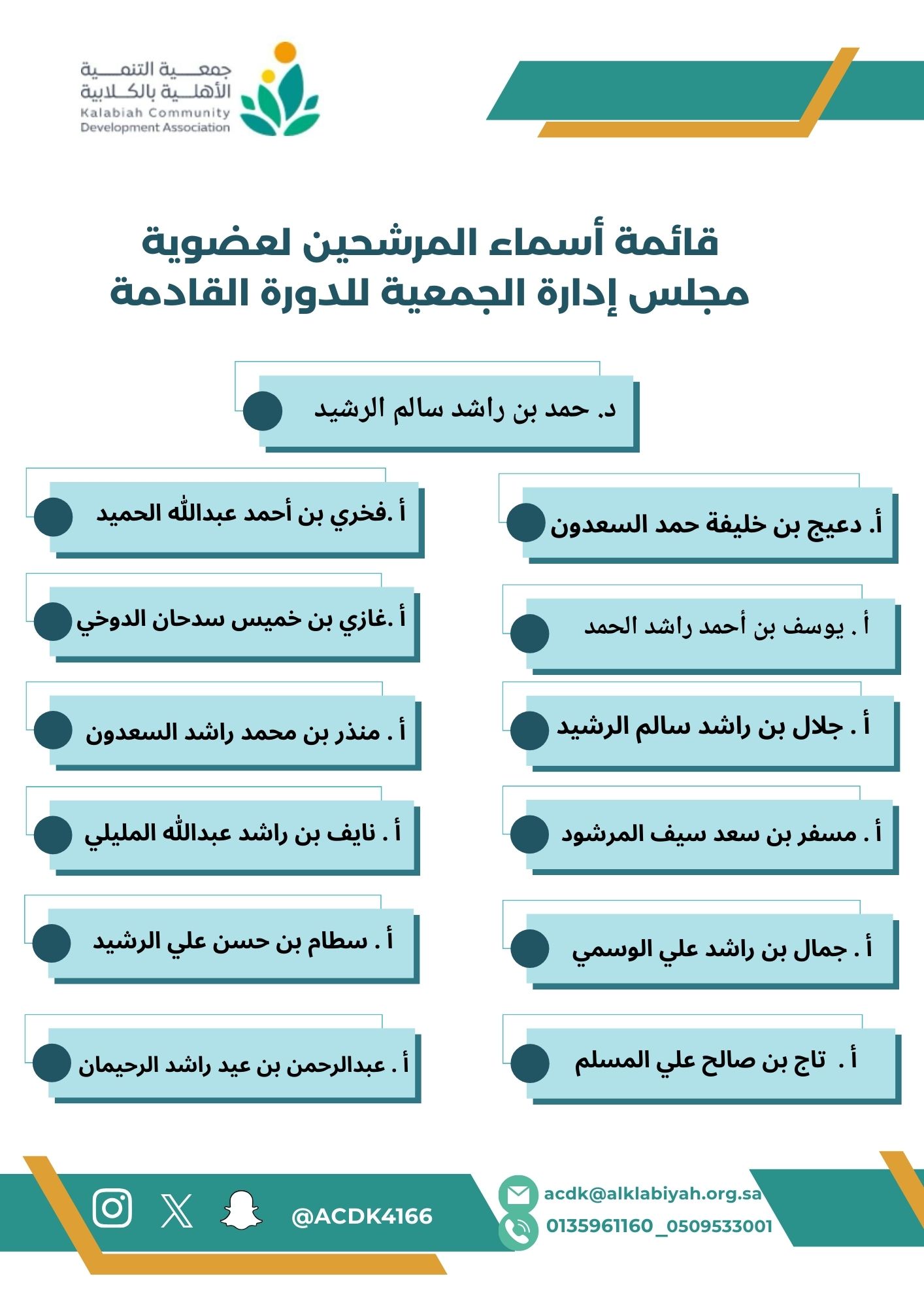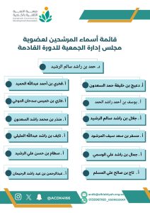 قائمة أسماء المرشحين لعضوية مجلس إدارة الجمعية للدورة القادمة.
